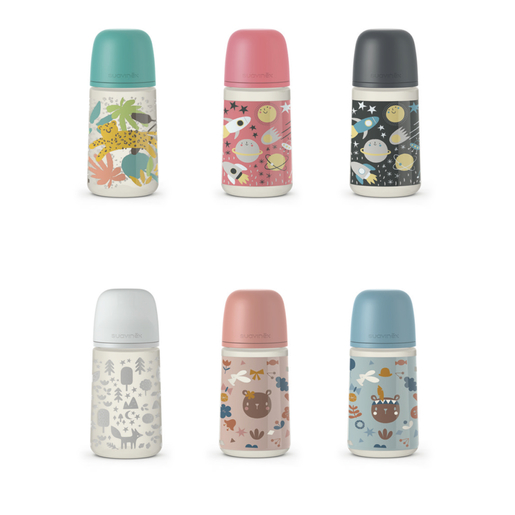 Biberon Prints 270ml, nueva botella, forma recta que ofrece un agarre más cómodo para el bebé. Con tetina Fisiológica SX Pro flujo medio, a partir de 3 meses, deja pasar todo tipo de líquidos de densidad media, ideal para leche, zumos o agua